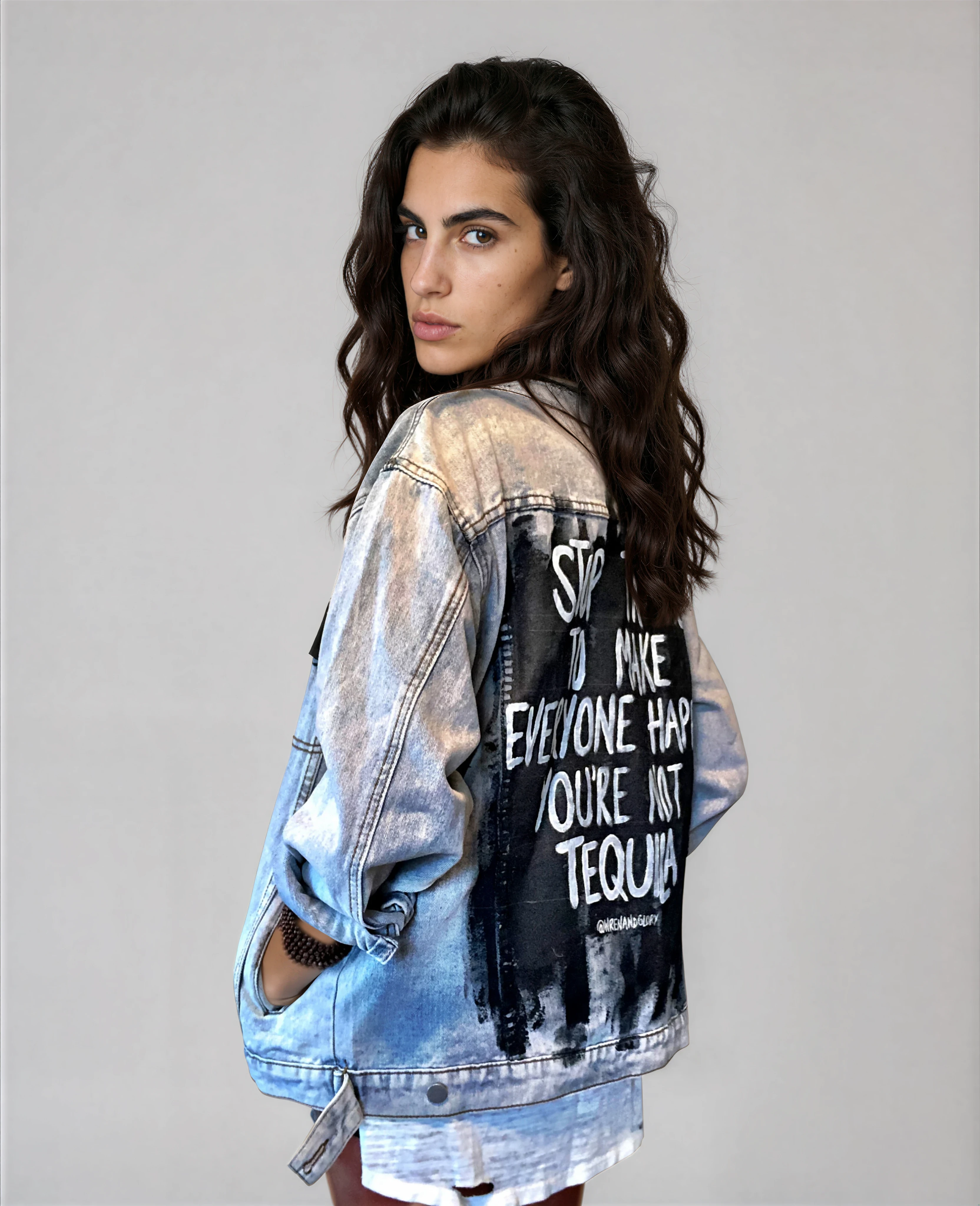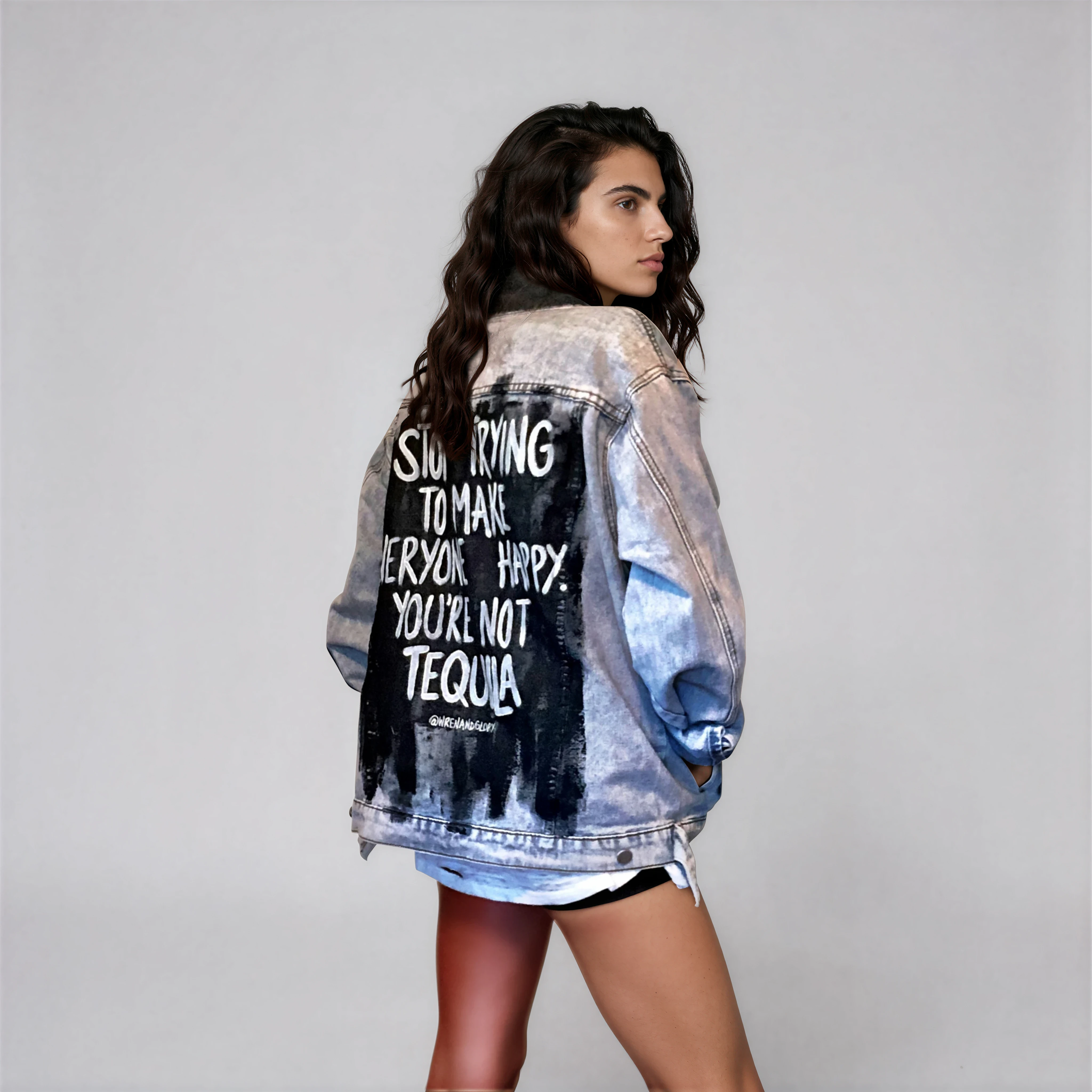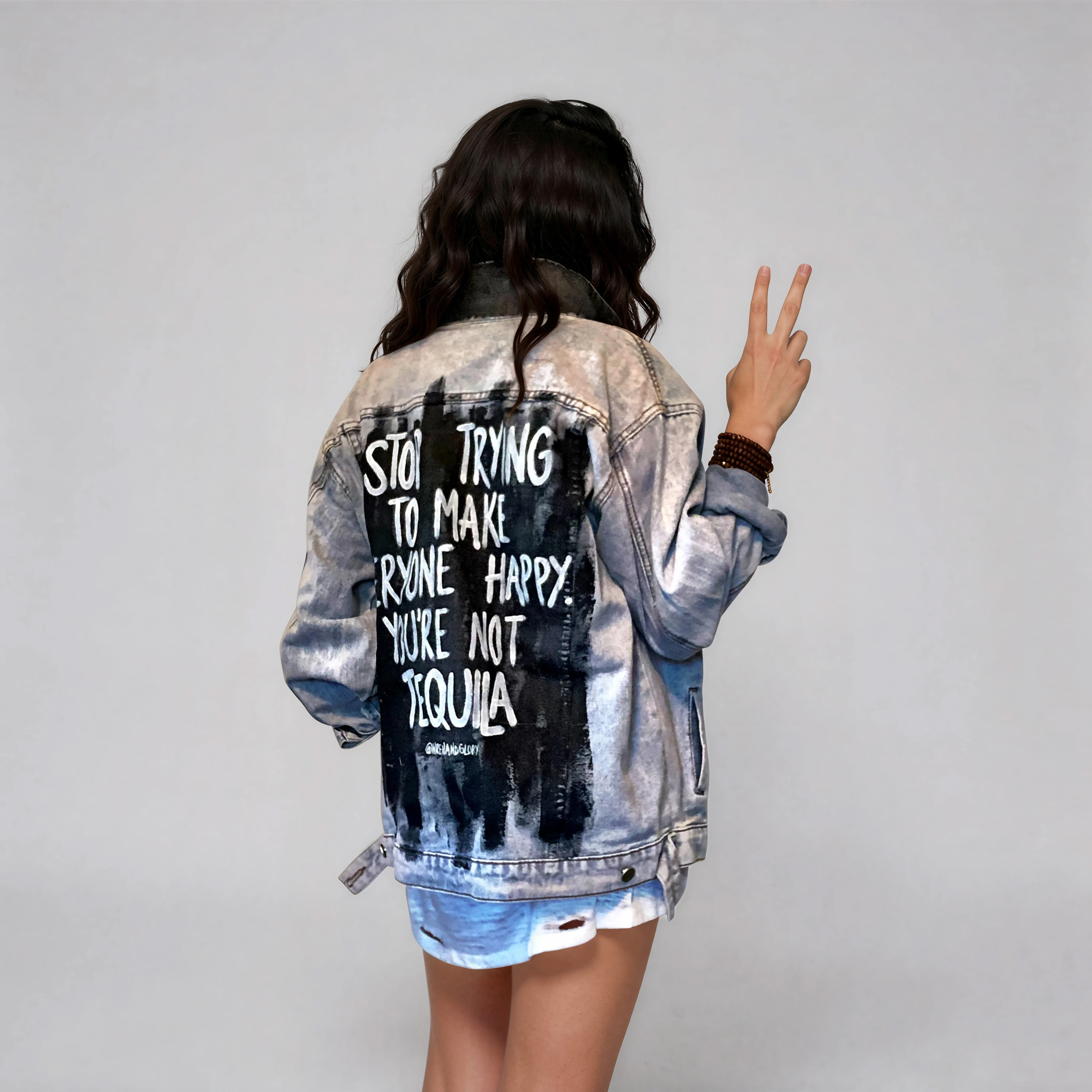 'STOP TRYING TO MAKE EVERYONE HAPPY. YOU'RE NOT TEQUILA' painted in white, over a black base with collar and front pockets painted black. Signed @wrenandglory. Due to each piece being hand painted, each jacket might have slight differences. Limited Edition.
