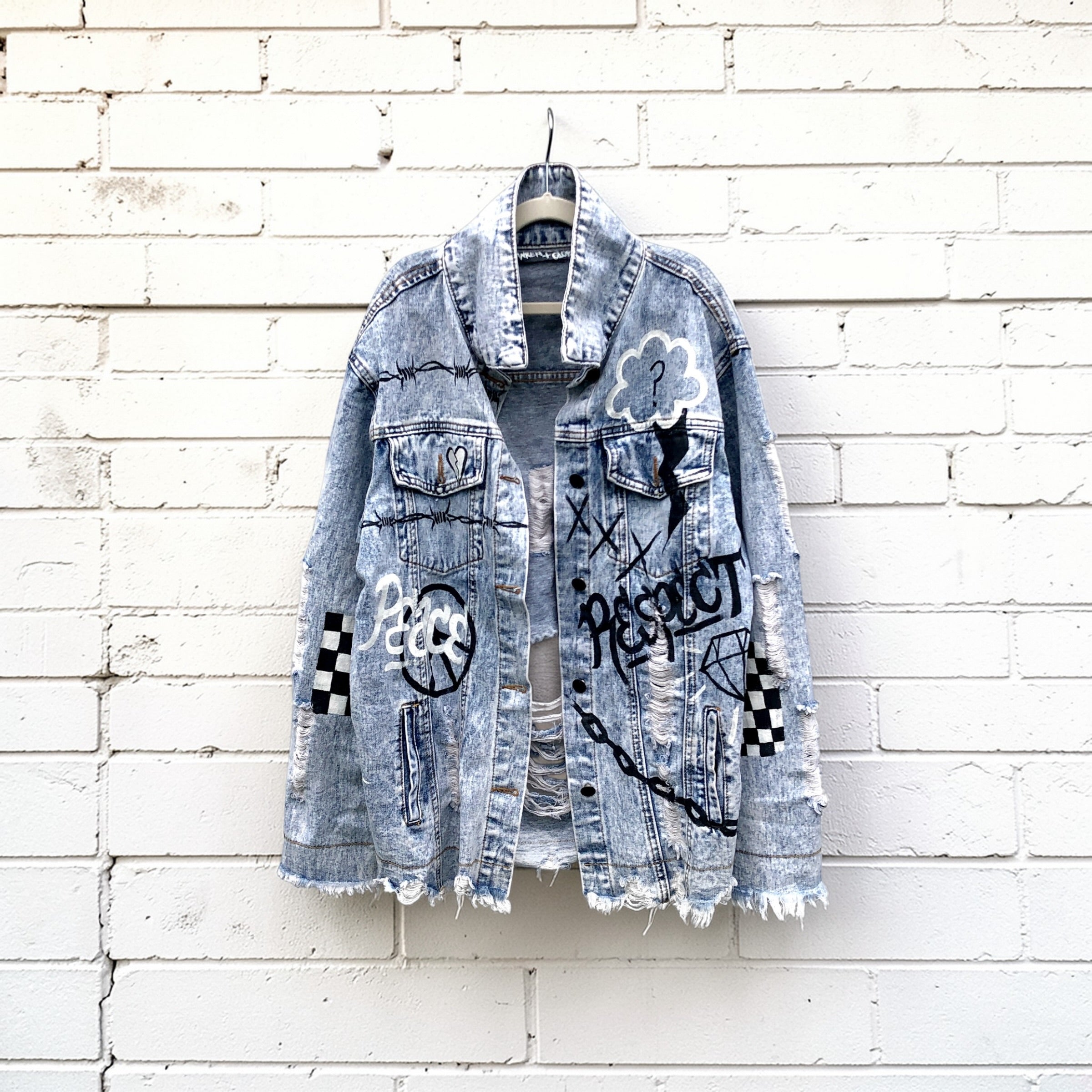 - Graffiti style paint throughout entire jacket, in black and white.