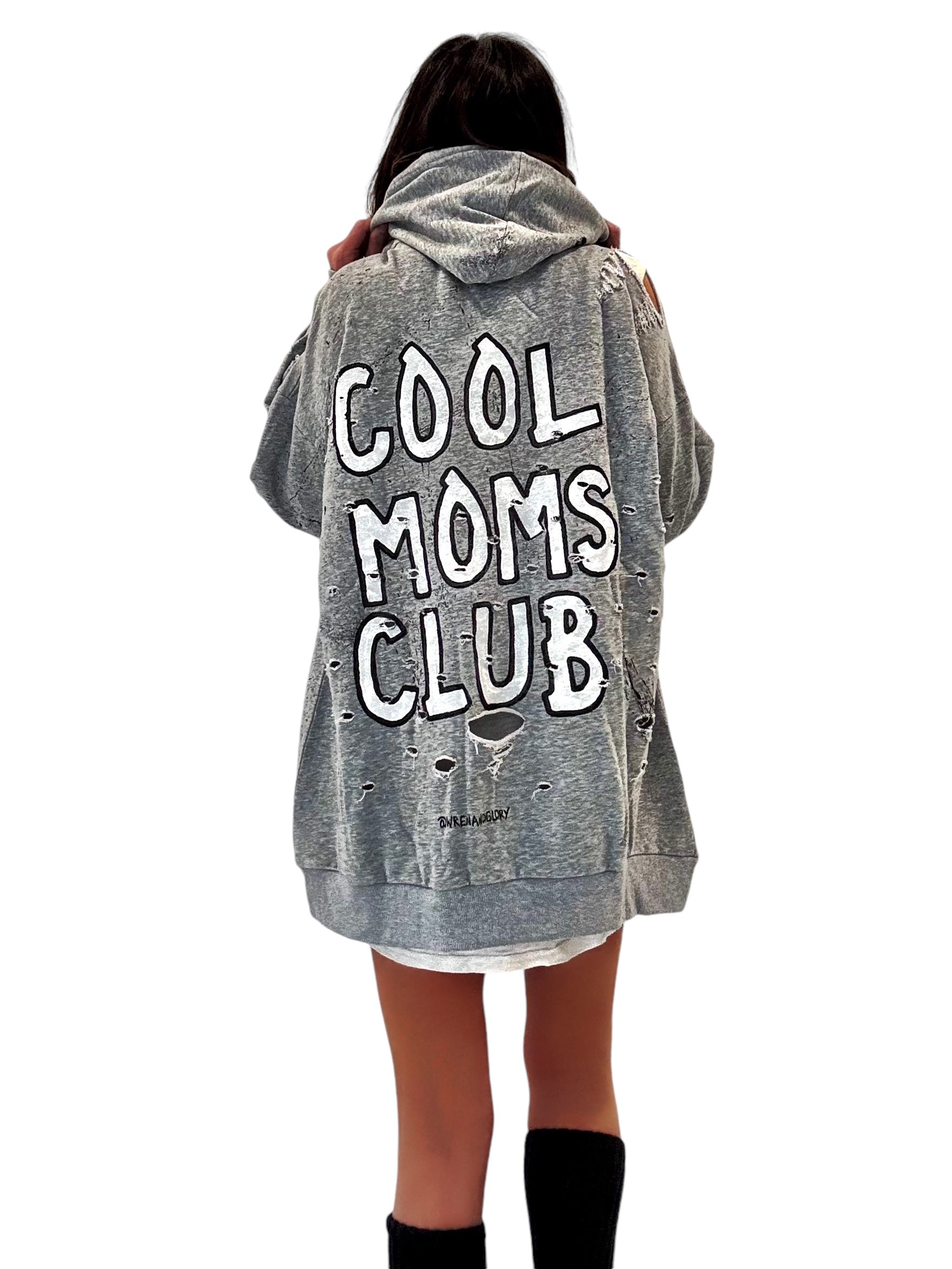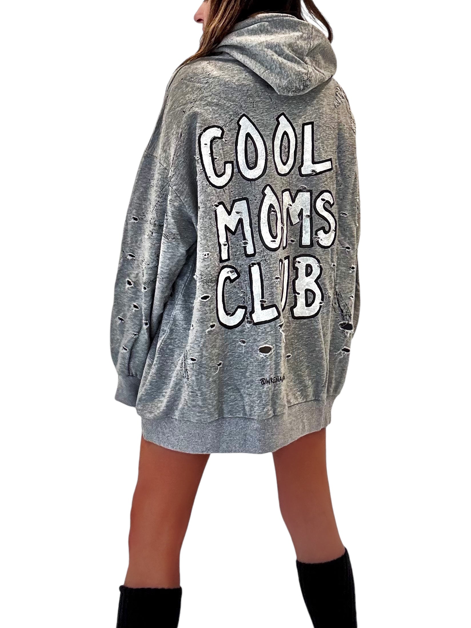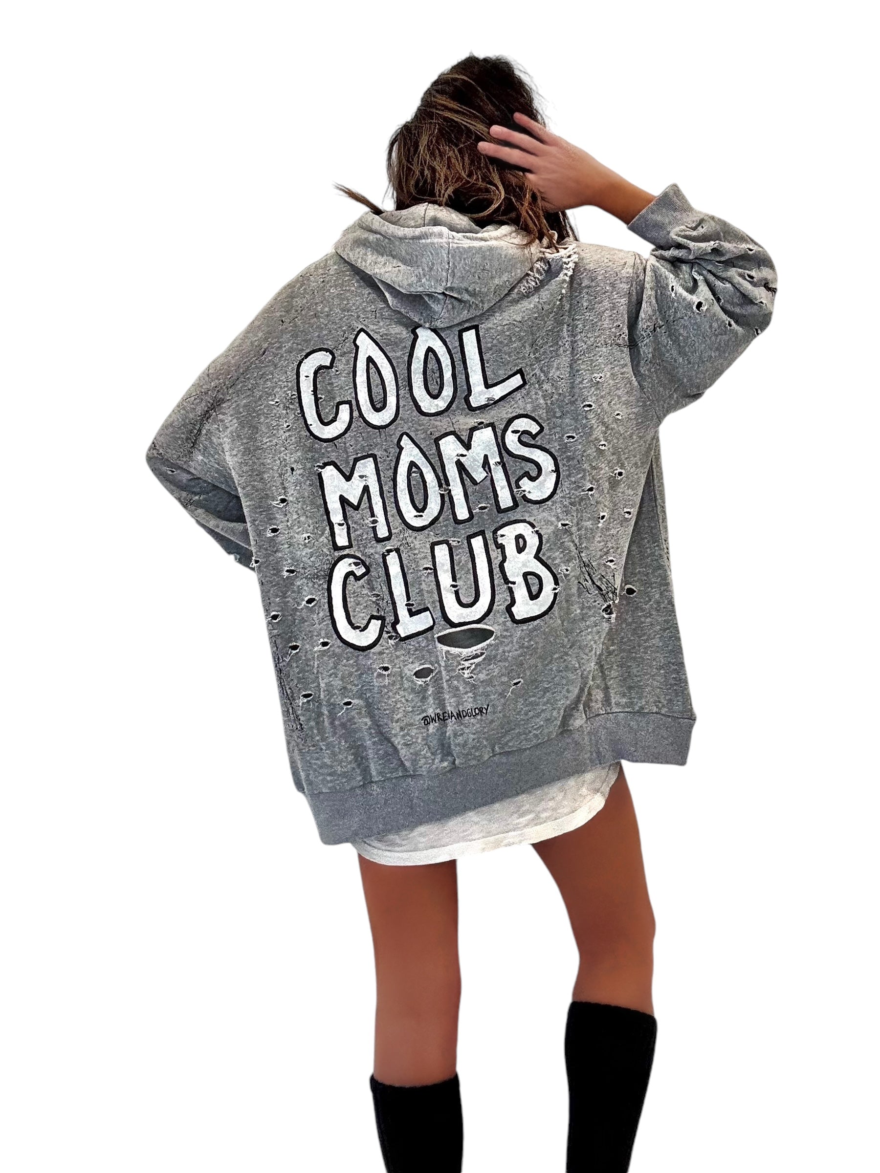- Cool Mom's Club painted on the back in white with black outline, with black splatter surrounding entire sweatshirt
